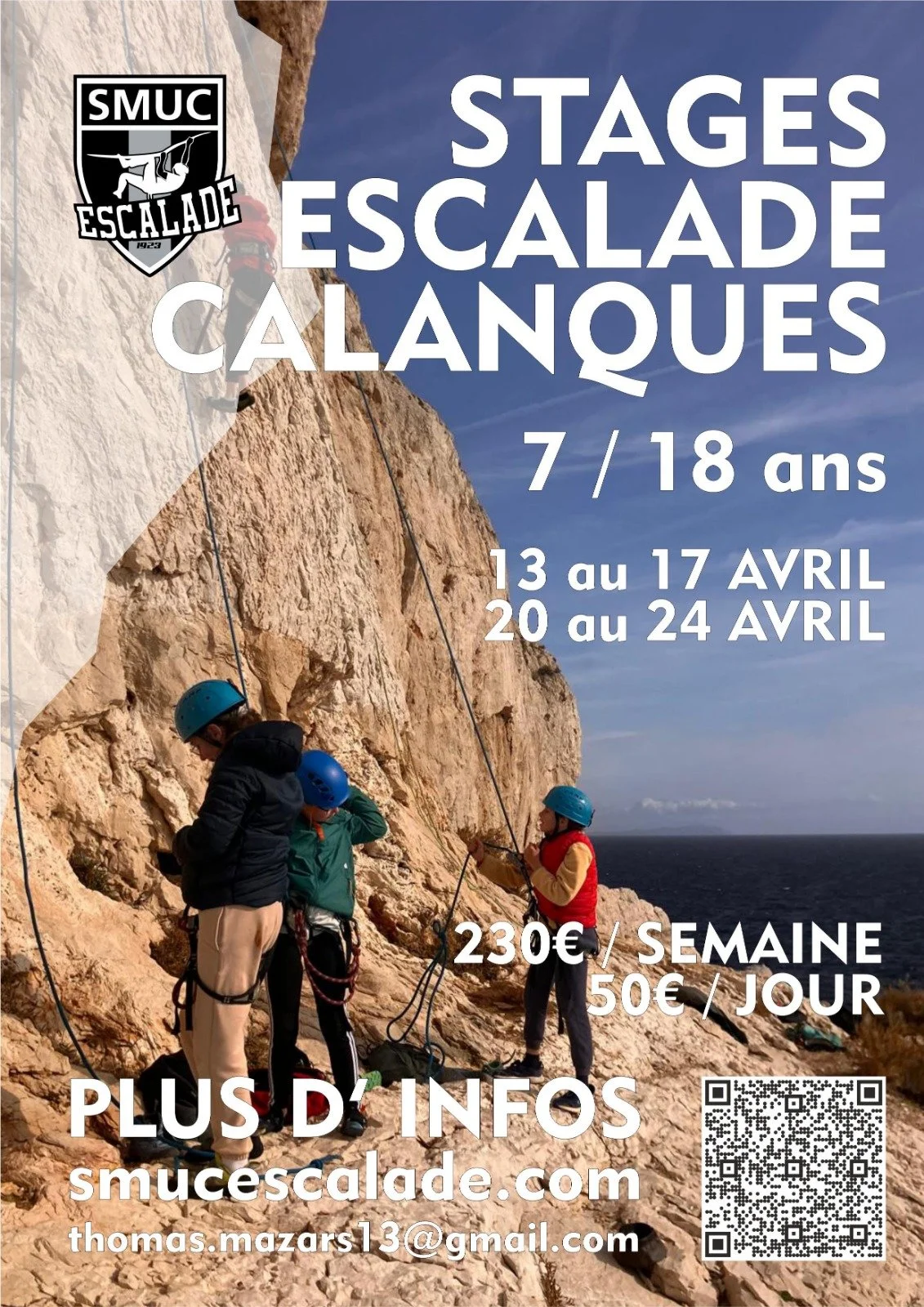 Encadrés par l’équipe du SMUC, ces stages en plein air permettent aux jeunes de découvrir ou de progresser en escalade sur les falaises naturelles des Calanques dans un cadre exceptionnel et sécurisé.